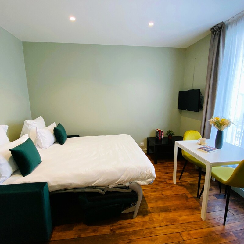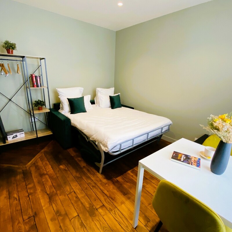 The studio is composed of a living area with a high-quality sofa bed for maximum comfort, a dining area, a shelf and a television.