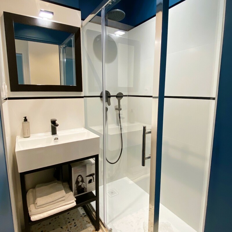 In the shower room there is a set of towels, mats, shower gel, hand gel and a hairdryer. An ironing board and iron are also at your disposal.