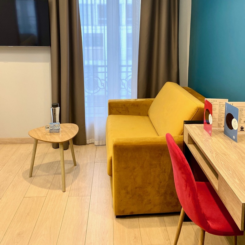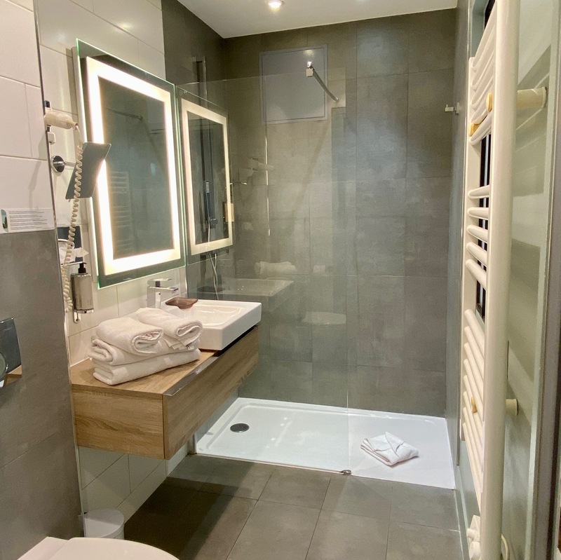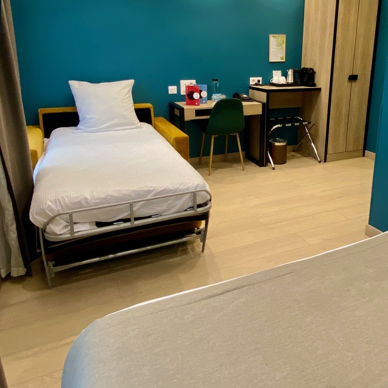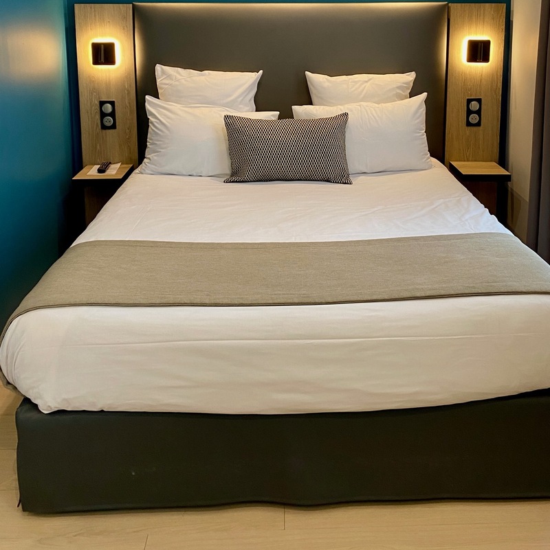 Cette chambre de 19m² pouvant accueillir de 1 à 3 personnes, spacieuse et cosy, sera très agréable pour un séjour d'affaires, en couple ou en famille. Vous trouverez le confort d’une literie haut de gamme, d’un coin salon avec fauteuil convertible une place et d'un espace de travail équipé d'une machine Nespresso. Sa salle de bain privative est dotée de wc suspendus, d’une douche à l’italienne, et d’un lavabo avec miroir lumineux.