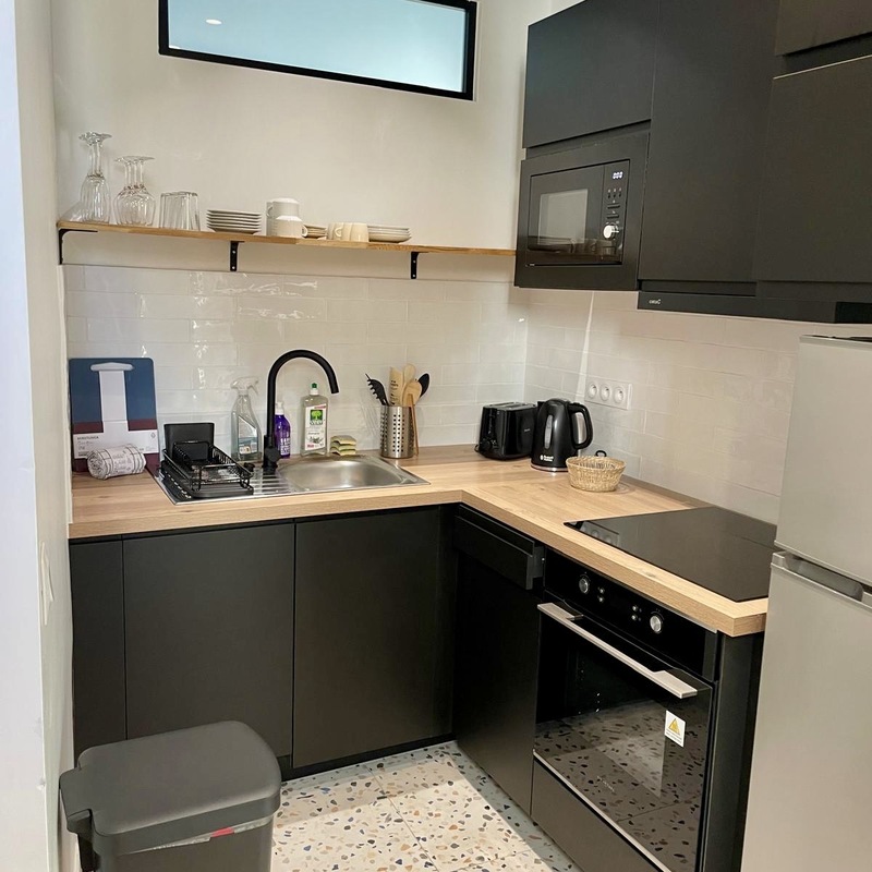 - D’une cuisine entièrement équipée : plaques de cuisson, four, micro-ondes, bouilloire (avec quelques dosettes de café et sachet de thé), grille-pain, vaisselle, ustensiles de cuisine et kit de nettoyage.
